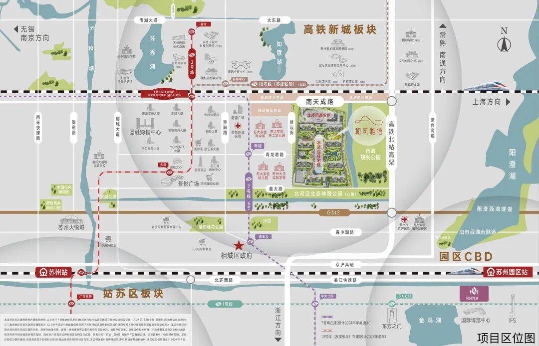 【全龄段优质配套,满足一家人的需求】教育:周边聚集了苏州大学实验学校(从幼儿园到高中)、南师大苏州实验学校等名校,人文氛围浓厚。(具体学区以交付后划分为准)医疗:有高铁新城医院、在建的苏州市妇幼保健院以及相城人民医院,健康有保障。生态:东侧有规划公园,南边是在建的北河泾生态体育公园,还有环秀湖公园、中国花卉植物园,堪称住在城市绿肺里。商业与文体:吾悦广场、大悦城、圆融等商场环绕;更有高铁之心、国际会议酒店、以及规划中的大剧院、美术馆、艺术中心等,繁华与艺术触手可及。这些醇熟配套完美满足了改善型住宅对品质生活的追求。